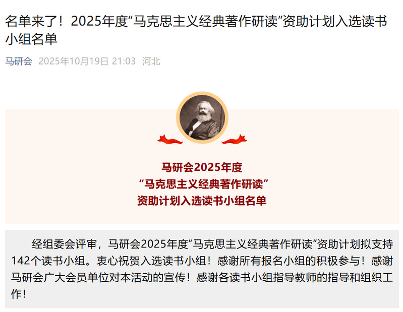 近日,中国高等教育学会马克思主义研究分会(以下简称马研会)发布了2025年度“马克思主义经典著作研读”资助计划入选读书小组名单。经组委会专家的严格评审,由申明远、郑伟民老师指导的青年马克思主义研究协会“海马青年《习近平谈治国理政》读书小组”成功入选了该项资助计划,这是继2024年协会入选优秀结项后再次入选。