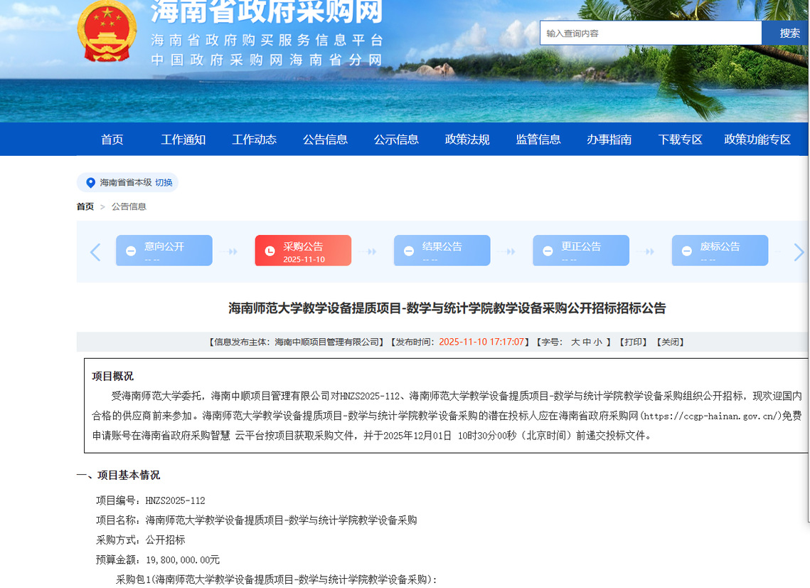 公告链接:https://ccgp-hainan.gov.cn/maincms-web/articleHn?type=notice&id=ca500064-2a67-4ead-bdec-b754a6f8392d&planId=8a1d17439a0421bd019a14c02cfc37fd&channel=c5bff13f-21ca-4dac-b158-cb40accd3035