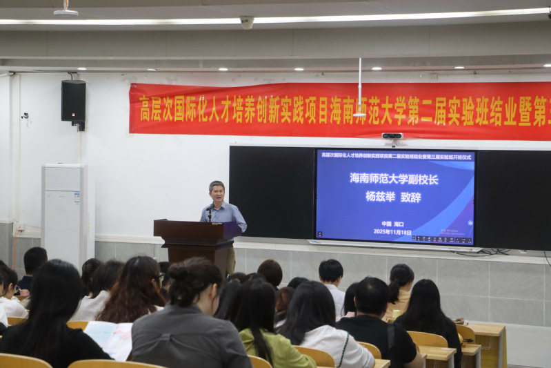 11月18日,教育部中外人文交流中心高层次国际化人才培养创新实践项目——海南师范大学第二届实验班结业典礼暨第三届实验班开班仪式在我校龙昆南校区文科楼101报告厅举行。校党委常委、副校长杨兹举出席活动并致辞。项目服务单位、我校相关职能部门负责人,第二届、第三届实验班和国际中文教育专班学员参加活动。