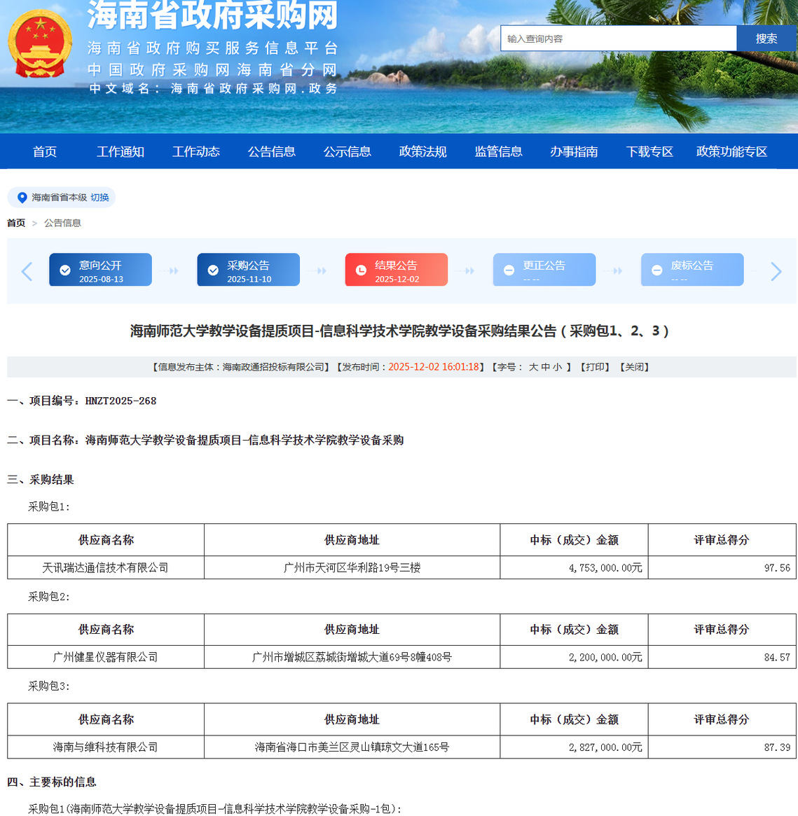公告链接:https://ccgp-hainan.gov.cn/maincms-web/articleHn?type=notice&id=14834e59-6ac1-4f7a-9775-1e69d8039a22&planId=8a1d13439a01264e019a14b0710826f6&channel=c5bff13f-21ca-4dac-b158-cb40accd3035