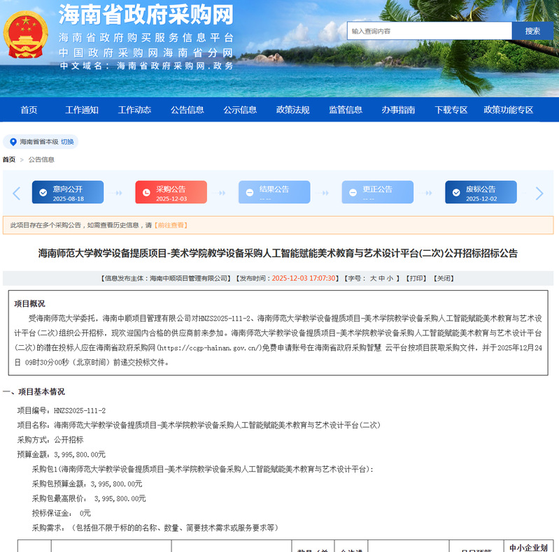 公告链接:https://ccgp-hainan.gov.cn/maincms-web/articleHn?type=notice&id=cfb3b3b2-bd47-46e4-b875-eff28c34c4c3&planId=8a1d13439a01264e019a29edcc3961f2&channel=c5bff13f-21ca-4dac-b158-cb40accd3035