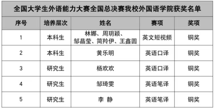 近日,2025“外研社·国才杯”“理解当代中国”全国大学生外语能力大赛全国总决赛在北京落幕。我校外国语学院学子在国赛中凭借扎实的专业功底与出色的综合素养,斩获英文短视频赛项铜奖1项、英语口译赛项铜奖2项、英语笔译赛项铜奖2项。