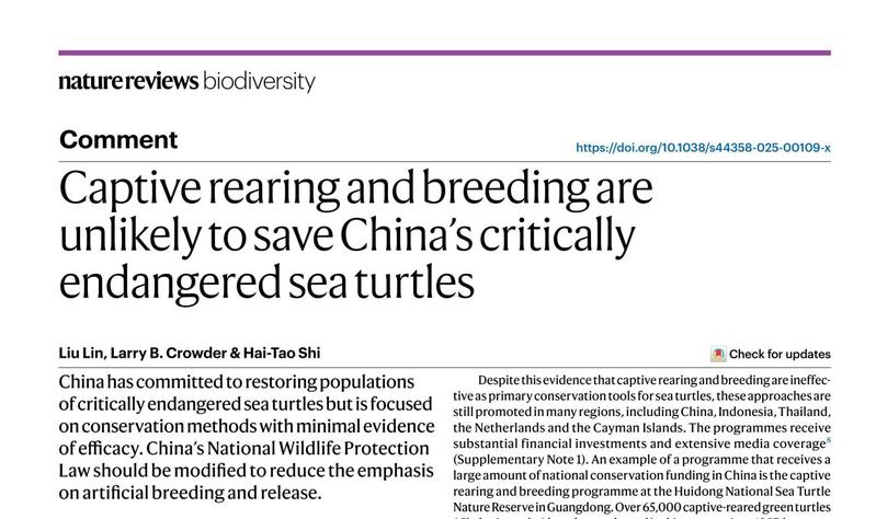 近日,我校生命科学学院史海涛、林柳教授及美国斯坦福大学的Larry Crowder教授在《Nature Reviews Biodiversity》发表了题为“Captive rearing and breeding are unlikely to save China’s critically endangered sea turtles”的评述文章。该文指出,中国海龟保护措施过度依赖人工繁育与放流,这种方法难以拯救海龟野生种群,呼吁调整保护策略,聚焦于栖息地恢复、野生个体保护和执法监督等根源性措施。