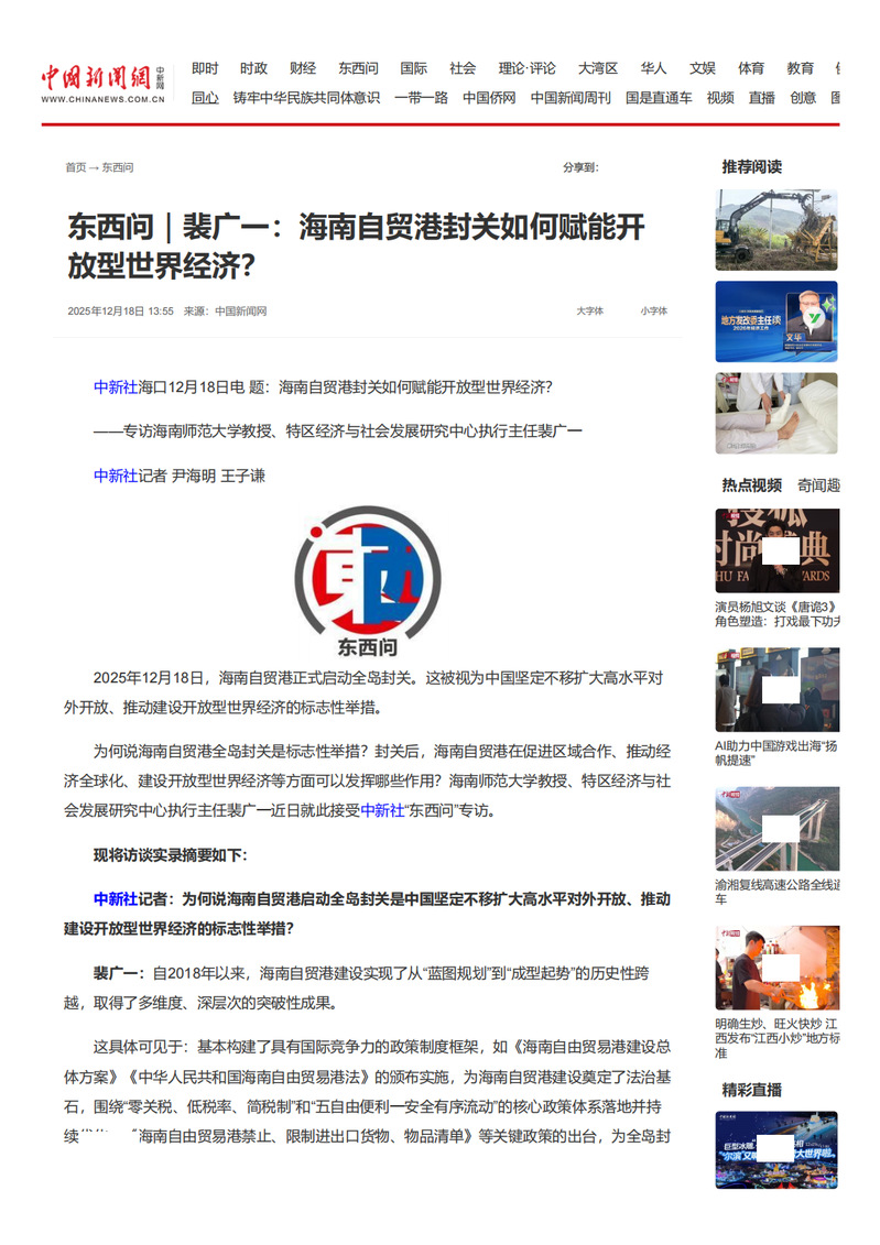 12月14-18日,时值海南自由贸易港正式启动全岛封关的关键时期,中国新闻社专访我校裴广一教授,并以《中新社关注:海南自贸港封关在即,解码开放“财富密码”》《海南自贸港封关如何赋能开放型世界经济》为题进行报道。