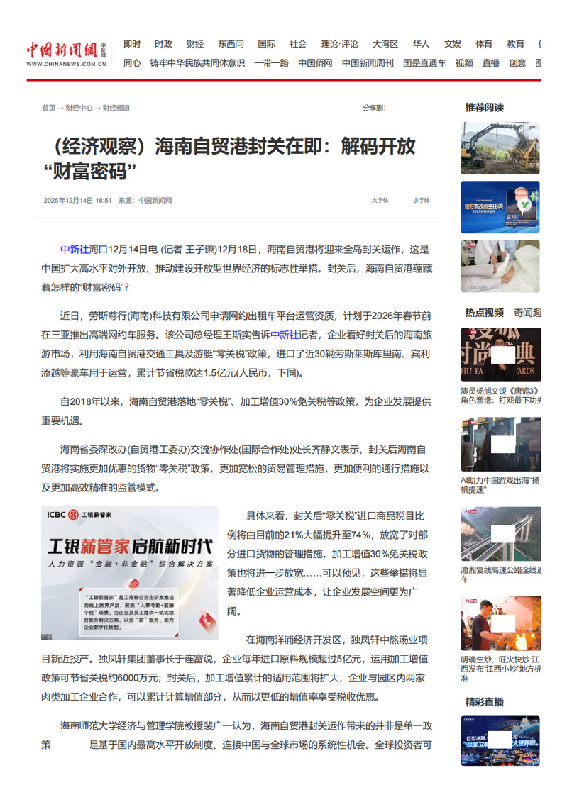 《中新社关注:海南自贸港封关在即,解码开放“财富密码”》报道链接: