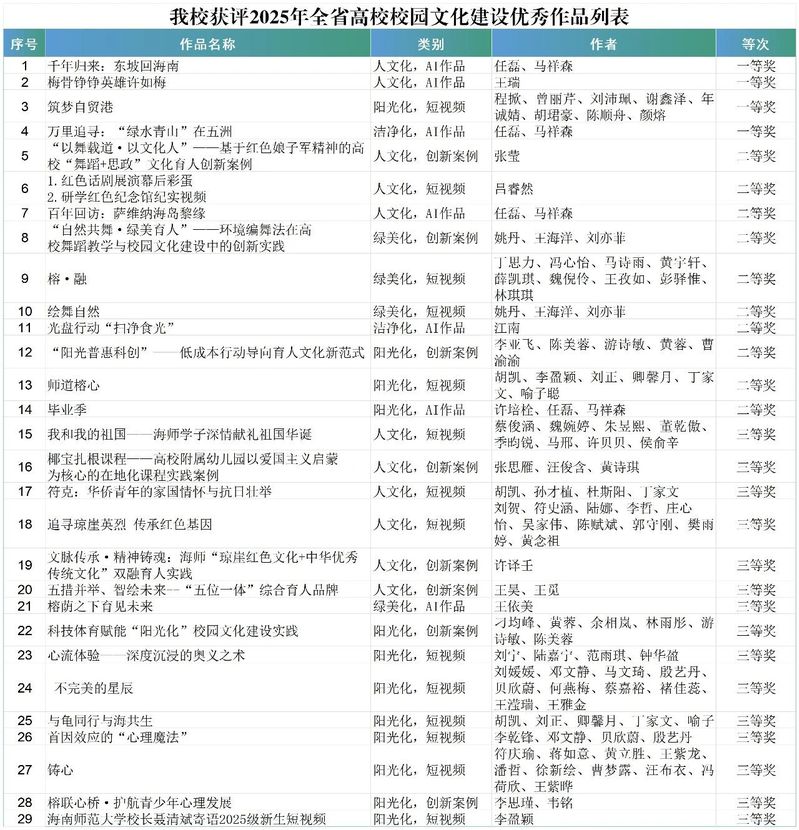 近日,中共海南省委教育工作委员会、海南省教育厅公布2025年全省高校校园文化建设优秀作品评选结果,共评选出156项获奖作品。我校29项师生作品获奖,其中一等奖4项,二等奖10项,三等奖15项。