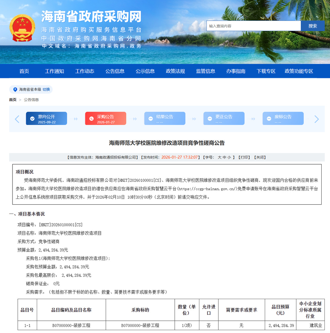 公告链接:https://ccgp-hainan.gov.cn/maincms-web/articleHn?type=notice&id=8cc7bfe5-24b4-4899-bbc8-ab984206aaf2&planId=8a1d08139ba34bee019bfd627a315254&channel=c5bff13f-21ca-4dac-b158-cb40accd3035